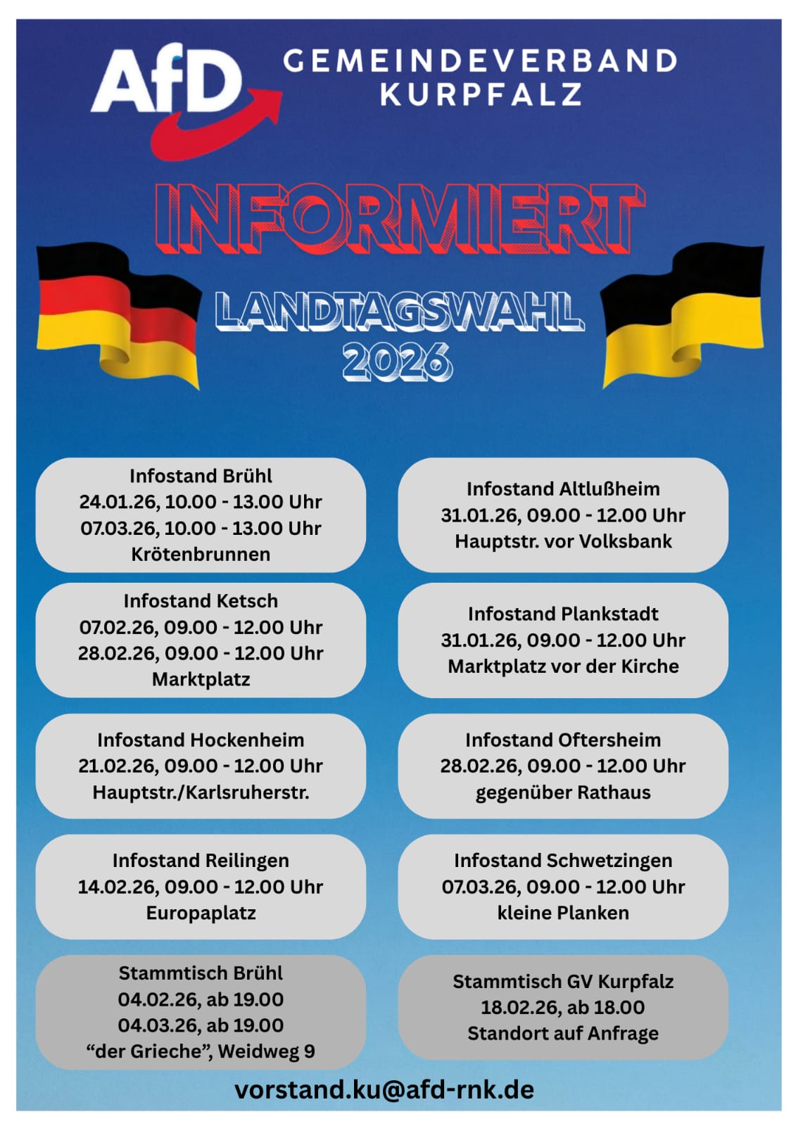 Dort setze ich mich für transparente, nachvollziehbare Entscheidungen im Interesse der Bürger ein. Als Direktkandidat der AfD für den Landtagswahlkreis 40 Schwetzingen möchte ich diese Werte – Ehrlichkeit, Bodenständigkeit und echtes Interesse an den Anliegen der Menschen – auf Landesebene einbringen.